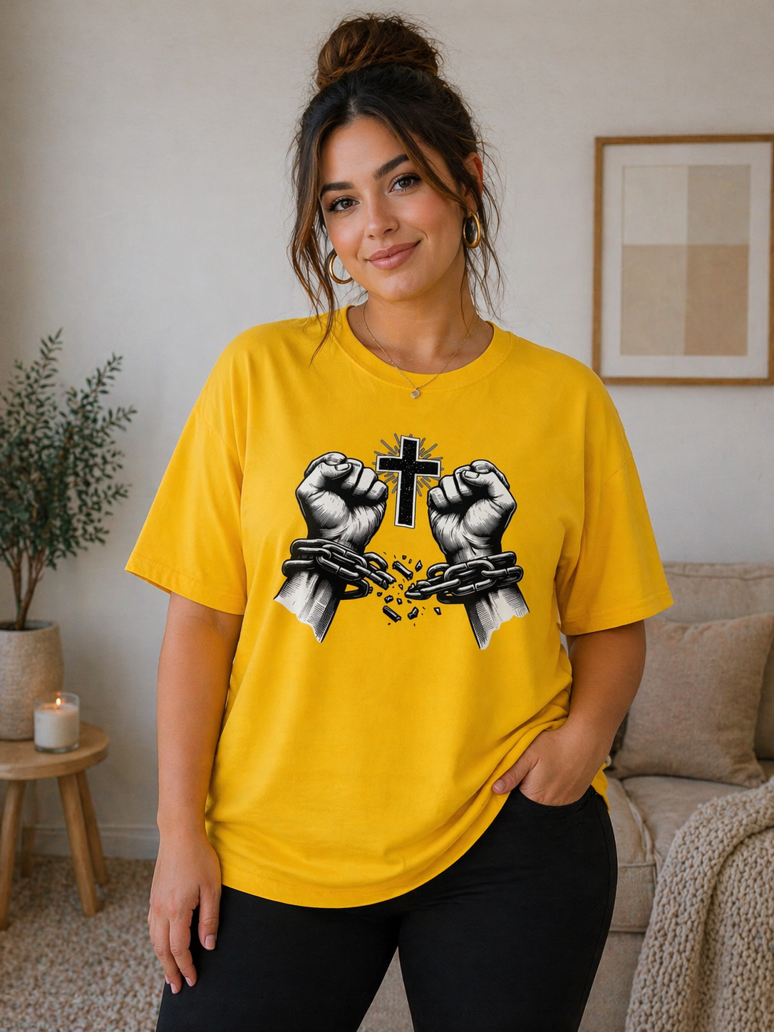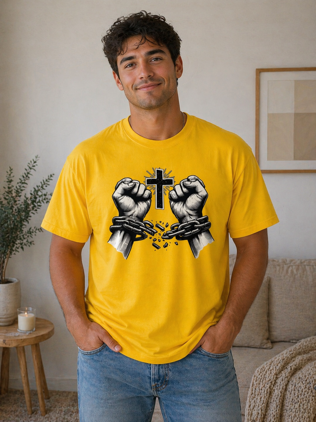 The Breaking Chains unisex cotton t-shirt offers a comfortable and breathable fabric, ideal for daily wear. Made from 100% cotton, it ensures durability with proper care. The unisex design accommodates a wide range of body types, making it a versatile addition to any wardrobe.