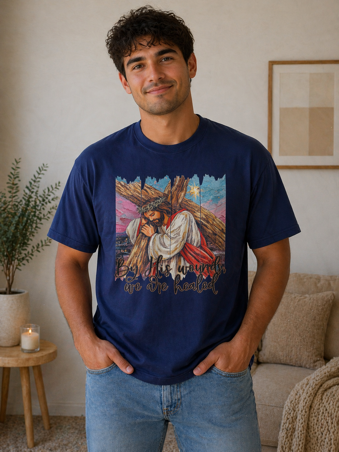 The "By His Wounds We Are Healed" unisex cotton t-shirt is crafted from high-quality cotton, ensuring comfort and breathability. Its durable fabric and classic fit provide versatility for various occasions, making it suitable for everyday wear while promoting a meaningful message.