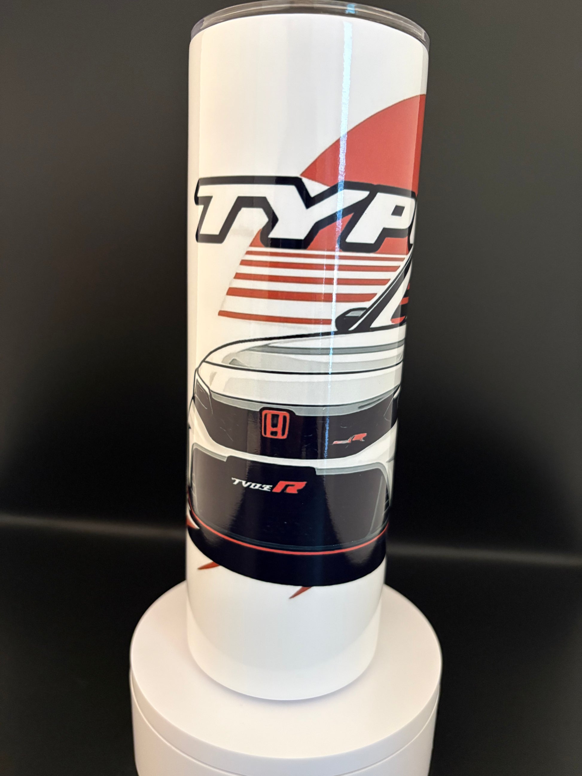 The Honda TypeR 20oz Skinny Tumbler is designed for durability and comfort, featuring an ergonomic shape for easy grip. Its 20-ounce capacity is ideal for maintaining hydration during extended periods. The design reflects the performance ethos of Honda, appealing to automotive enthusiasts while ensuring practical use in daily activities.
