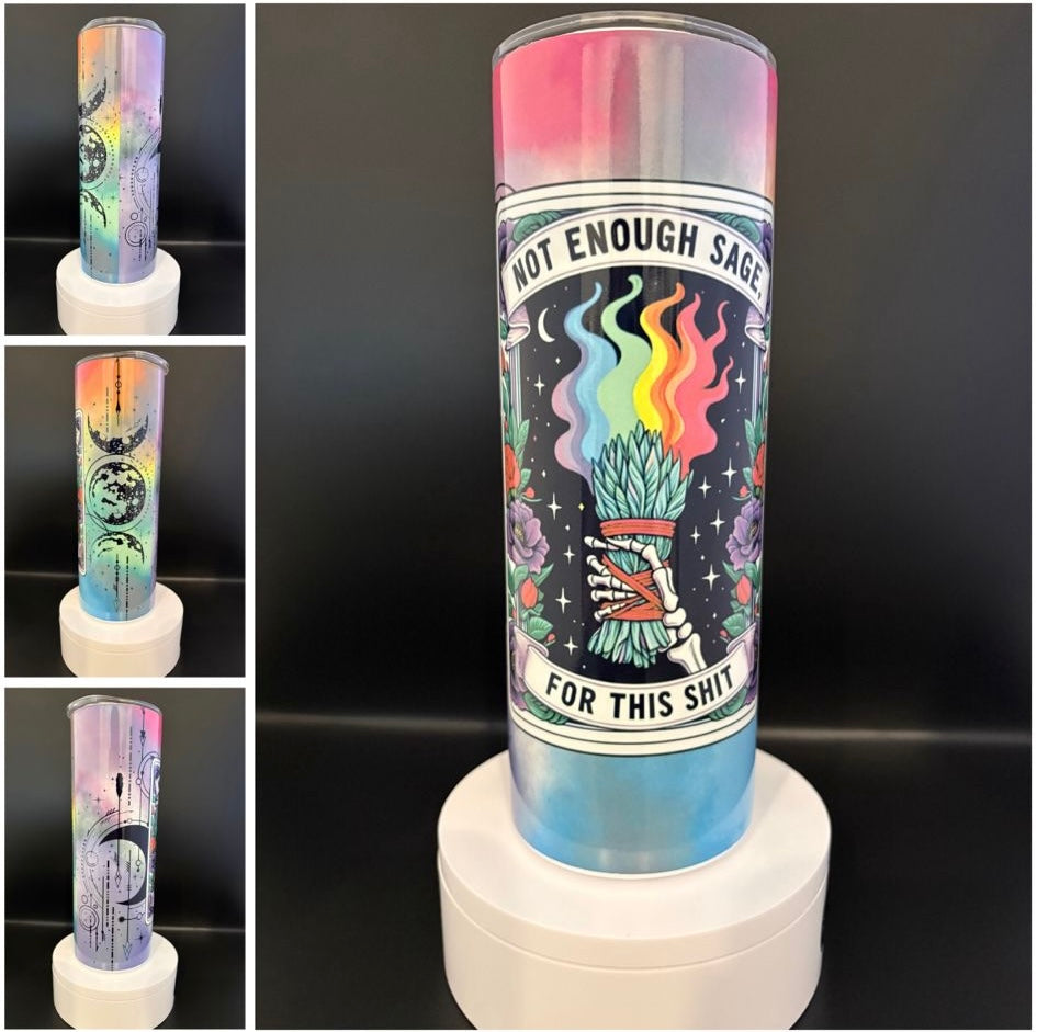 The Not Enough Sage Tumbler is a 20oz skinny beverage container designed for optimal hydration. Its sleek design fits comfortably in hand and most cup holders, while the durable construction ensures long-lasting use. Ideal for both hot and cold beverages, it maintains temperature effectively, enhancing your drinking experience.