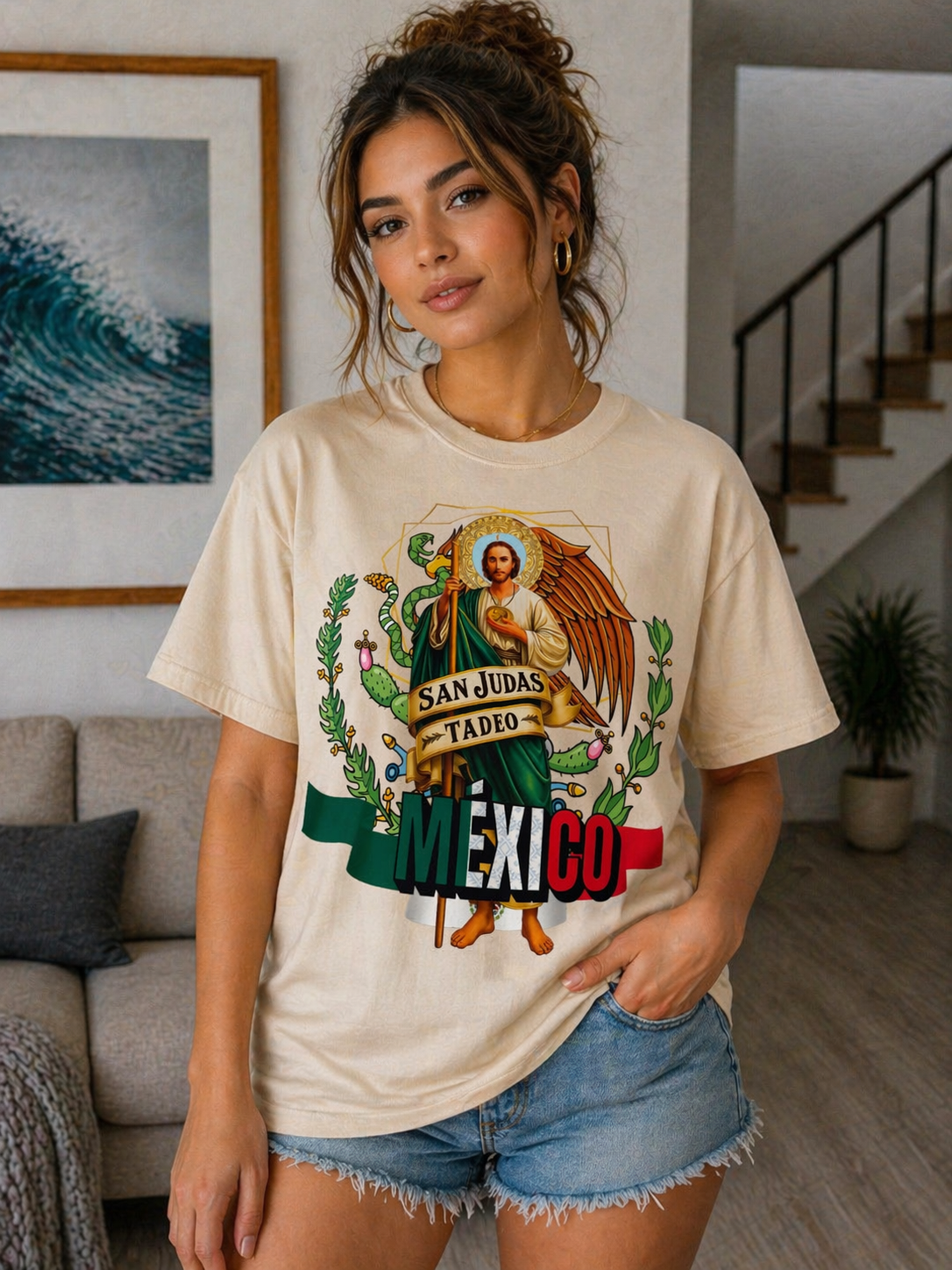 The San Judas Tadeo cotton t-shirt provides comfort through its high-quality, breathable cotton fabric. This garment is designed for durability, ensuring it maintains its shape and color after multiple washes. Ideal for everyday wear, it combines functionality with a meaningful representation of faith.
